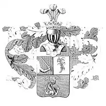 Описание герба: Выписка из Гербовника В щите, разделённом горизонтально надвое, в верхней части в правом красном поле изображена выходящая из облака рука с мечом, а в левом серебряном поле пальмовая ветвь, в нижней части в голубом поле два серебряных якоря и обвившийся около них дельфин. Щит увенчан дворянскими шлемом и короною с тремя страусовыми перьями. Намёт на щите голубой и серебряный, подложенный серебром и красным. (Гербовник, X, 143). |