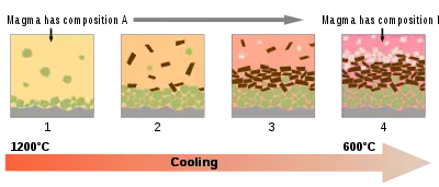 В процессе поднятия и последующего охлаждения магма претерпевает много сложных и динамических композиционных изменений. Тяжелые минералы могут кристаллизоваться и осесть на дне магматической камеры. Магма может также ассимилировать части той породы, в которой она находится, или же смешиваться с другими порциями магмы. Эти процессы изменяют химический и минеральный состав расплавленной смеси, поэтому любая магма, достигающая поверхности, может иметь совсем другой химический состав, чем родительский расплав. Магму, изменившуюся таким образом называют «эволюционировавшей», чтобы отличить ее от «примитивной» магмы, которая по своему составу является весьма близкой к своему источнику в мантии (см. дифференциация магмы и фракционная кристаллизация). Магма, эволюционировавшая в большей степени, обычно состоит из кислых горных пород, обогащенных кремнием, летучими веществами и другими легкими элементами, которые и отличают этот тип магмы от богатой железом и магнием (мафичной) примитивной магмы. Степень и объем, в которых магма эволюционирует с течением времени, свидетельствуют об уровне внутреннего тепла планеты, а также ее тектонической активности. Континентальная кора Земли состоит из гранитных пород из эволюционировавшей магмы; эти породы образовались в результате многочисленных эпизодов магматической переработки. Эволюционировавшие магматические породы значительно менее распространены в холодных, мертвых космических телах, таких как Луна. Марс, размер которого находится примерно посередине между размерами Земли и Луны, имеет также средний уровень магматической активности.