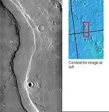 Вулканические равнины распространены на Марсе. Обычно различают два типа таких равнин: равнины, на которых распространены детали рельефа, образованные из лавовых потоков, и равнины, где такие детали рельефа вообще отсутствуют, однако имеются другие признаки их вулканического происхождения. Равнины с большим количеством лавовых потоков встречаются в пределах и вокруг крупных вулканических провинций Tharsis и Elysium.[6] К потоковым деталям рельефа относятся как плоскостные поверхностные, так и трубчатые или каналоподобные потоковые морфологии. Плоскостные поверхностные потоки образуют сложные лопастеподобные потоковые взаимоперекрывающиеся образования и могут простираться на многие сотни километров от своего источника.[40] Потоки лавы могут формировать лавовые туннели, когда верхний открытый слой лавы застывает и затвердевает, образуя своеобразное перекрытие, тогда как лава под ним продолжает двигаться. Часто бывает так, что после того, как лава покидает такой тоннель, его «крыша» проваливается внутрь, в результате чего образуется канал или линия эрозионных кратеров (catena).[41]