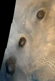 Вулканическая активность (вулканизм) сыграла значительную роль в геологической эволюции планеты Марс.[2] Начиная с миссии космического аппарата Маринер-9 1972 года ученым было известно, что вулканические детали рельефа покрывают значительную часть поверхности Марса. К этим деталям относятся масштабные лавовые потоки, необъятные лавовые равнины и крупнейшие из всех известных вулканов в Солнечной системе.[3][4] Возраст марсианских вулканических деталей варьируется от времен нойского (>3.7 миллиарда лет) до позднего амазонского периода (<500 миллионов лет), что свидетельствует о том, что вулканическая активность на планете существовала в течение всей ее истории,[5] а отдельные исследователи высказывают предположение, что такая активность присутствует на планете и до сих пор.[6][7] Как Земля, так и Марс являются большими, дифференцированными планетами, созданными из похожих хондритных материалов.[8] Немало магматических процессов, происходящих на Земле, также происходили и на Марсе; кроме того, композиционно планеты являются достаточно сходными, чтобы можно было применять одни и те же названия их магматических горных пород и минералов.