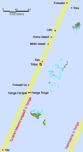 Вулканы Тонга являются частью островной вулканической дуги Тонга-Кермадек. Предпоследним по времени проявлением вулканической активности на территории королевства является извержение подводной кальдеры Хунга-Тонга-Хунга-Хаапай, длившееся с декабря 2014 года по январь 2015 года[1]. Затем извержение 2022 года