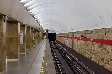 Отличительная особенность отделки станции: колонны и путевые стены выложены розовато-бежевым травертином, полы — серым гранитом.
