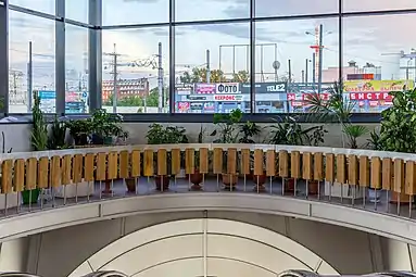 - Ранее все три нефа подземного зала станции были одинаковой длины; центральный торец украшала надпись «Выборгская», подобная тем, что расположены на путевых стенах. В постсоветский период часть вестибюля станции отдали на служебные нужды, закрыв три крайних пролёта среднего зала. В эти производственные помещения имеются два входа с разных сторон платформы, в обоих установлены металлические ворота-решётки, благодаря чему можно, проезжая с одной стороны платформы, увидеть другую сторону сквозь служебную комнату. Подобное в петербургском метрополитене, кроме «Выборгской», до 2014 года имело место и на станции «Лесная»[6], где в ходе капитального ремонта решётки были заменены сплошными металлическими дверьми. В 2015 году такая же замена произошла на «Выборгской», однако в 2019 году вместо дверей вновь были установлены решётки.