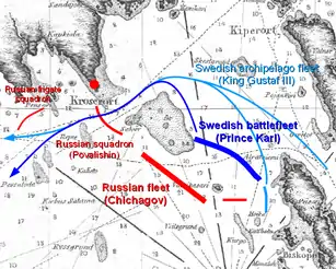 8 июня 1790 года русский Балтийский флот под командованием Чичагова блокировал оба морских прохода, ведущих в Выборгский залив, и стал дожидаться подхода гребной флотилии вице-адмирала принца Карла Генриха Нассау-Зигена со стороны Кронштадта. В блокаде шведского флота приняли участие основные русские силы из 50 линейных кораблей, фрегатов и малых кораблей с 2718 орудий и 21 тыс. матросов на борту, а также эскадра поддержки — 20 галер под командованием капитана Петра Слизова, 8 гребных шхерных фрегатов под командованием вице-адмирала Тимофея Козлянинова и 52 малые галеры.