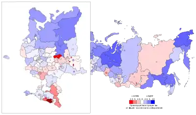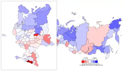 ![]() Верхняя карта показывает проценты голосов за партии, победившие в ТИК по единому округу. Нижняя карта показывает партии кандидатов, избранных в одномандатных округах, и набранные ими проценты голосов. | |||