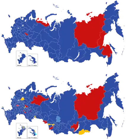 ![]() Верхняя карта показывает партии, победившие в субъектах федерации. Нижняя карта показывает партии кандидатов, победивших в одномандатных округах.