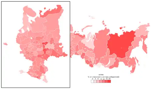 - Карта построена на основе доли голосов от списочного состава избирателей. Карта голосования за КПРФ, построенная на основе доли голосов от принявших участие в голосовании, сильно зависела бы от уровня явки и доли голосов за «Единую Россию». Пример: в Башкортостане при явке в 73 % и голосовании за ЕР в 67 % поддержка КПРФ составила 17 %; в Пермском крае явка 39 %, ЕР — 34 %, КПРФ — 23 %; при этом от списочного состава в Башкортостане за КПРФ проголосовало больше избирателей, чем в Пермском крае (11 % и 9 % соответственно); впечатление более солидной поддержки КПРФ в Пермском крае возникло исключительно из-за масштабного голосования за ЕР в Башкортостане.