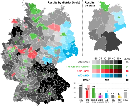 | Альтернатива для Германии (AfD) | 4 103 453 | 11,0 | +3,9 | 11 | +4 | |