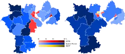 ![]() Результаты выборов в едином округе по территориальным избирательным комиссиям (слева) и одномандатных округах (справа) | |||