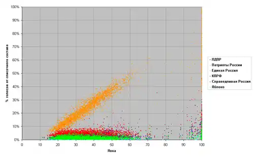 | Левада-Центр 28 сентября-2 октября 2009[28] | 55,4 % | 5,4 % | 16,6 % | 8,3 % | 2,8 % | 1,6 % | 10 % |