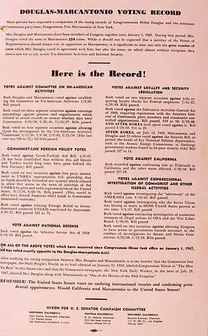 Во время избирательной кампании, Никсона, как и Дуглас, обвиняли в том, что во время голосовании они часто выражали ту же позицию, что конгрессмен из Нью-Йорка Вито Маркантонио. Маркантонио на тот момент был единственный членом Американской рабочей партии, который заседал в конгрессе и представлял в Палате восточный Гарлем. Многие называли Маркантонио коммунистом[12], однако, тот себя к ним не причислял. Маркантонио редко обсуждал СССР или коммунизм, а также не поддерживал запрет и ограничение коммунистов и коммунистической партии, объясняя это тем, что такие меры нарушают Билль о правах. Кроме этого, Маркантонио голосовал против требовании Комитета по антиамериканской деятельности, членом которого являлся Ричард Никсон[13].