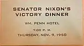 Часть репутации Никсона была построена на его участии в деле Элджера Хисса. В 1949 году суд не смог вынести вердикт по его делу. Возможность того, что суд оправдает Хисса, создало опасность для политического будущего Никсона, однако 21 января 1950 года суд признан Хисса виновным[49]. После, Никсон получил много поздравительных открыток, в том числе и от единственного живого бывшего президента США, Герберта Гувера[50].