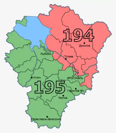 - № 194 "Ярославский": Дзержинский, Заволжский, Ленинский, Фрунзенский районы города Ярославля; Даниловский, Любимский, Некрасовский, Первомайский, Пошехонский, Тутаевский районы; восточная часть Рыбинского района; северная часть Ярославского района.