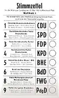 | Прочие кандидаты | Коммунистическая партия Германии, Свободные избиратели Рейнланд-Пфальца, Общегерманский блок, Союз немцев, партия единства, мира и свободы, Партия хороших немцев, Немецкие сельские жители | ||