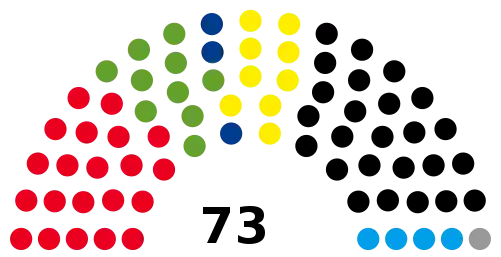 | Прошлые выборы | 22 / 69 (30,8%) | 22 / 69 (30,4%) | 10 / 69 (13,2%) |