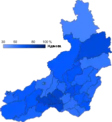 ![]() Карта результатов выборов. Синим цветом обозначены муниципальные образования, в которых победила Наталья Жданова. | |||