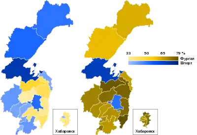 | г. Хабаровск[27][28][29][30][31] | 151 854 | 72,77 | 56 809 | 27,22 | 4 178 | 2,00 |