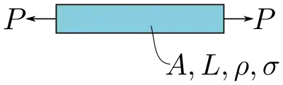 В первой ситуации на стержень воздействует собственный вес и растягивающая сила . Переменными материала являются плотность и напряжения Предположим, что длина и растягивающая сила определены в техническом задании, в таком случае они являются фиксированными переменными. Наконец, площадь сечения - свободная переменная. В данной постановке целью является минимизация массы путем выбора материала с оптимальным сочетанием переменных материала — . Рисунок 1 иллюстрирует данную задачу.