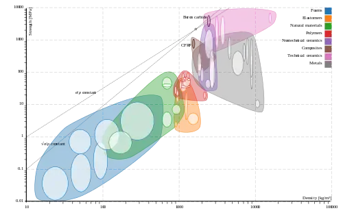 Получено два индекса эффективности: для случая растяжения и для случая изгиба . Первым шагом необходимо построить диаграмму Эшби, где в логарифмических масштабах отложить по одной из осей плотность, а по другой — прочность и нанести свойства материалов, подвергаемых анализу.