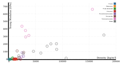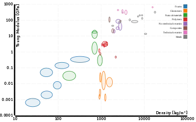 Верхняя диаграмма справа показывает соотношение между модулем упругости и плотностью в линейном масштабе. На диаграмме ниже показаны те же самые свойства материалов в логарифмическом масштабе. Разными цветами показаны разные классы материалов (полимеры, пенопласты, металлы и т.д.)[6].
