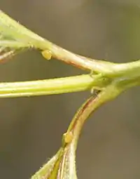| Нектарники | ![]() Экстрафлоральные нектарники калины | Нектарники могут быть флоральными (то есть развиваться в цветках) и экстрафлоральными, образующимися на вегетативных органах. Морфологически очень разнообразны: от нитевидной до дисковидной формы. Связаны с проводящими пучками, так как сахара, выделяемые нектарниками, поступают из флоэмы. По строению занимают промежуточное положение между наружными желёзками и гидатодами[10]. | Имеются у многих цветковых растений, например, калины, кизила, бирючины, вишни и др. |