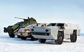 ![]() Боевые машины завода КАМАЗ. Справа налево: бронированная колёсная машина ВДВ на узлах и агрегатах КАМАЗ-43501, КАМАЗ-43269 «Выстрел», опытное бронешасси 6×6 «Воин» с башней БМП-2. | |||||||||||||||||||||||||||||