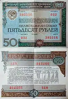 | 50 | 1982 | Государственный внутренний выигрышный заём | выигрышный | 20 лет | Не выплачен полностью, конвертирован в заём РФ 1992 года, а заем деноминирован в заём 1998 года, выплаты по которому завершены в 2005 году |