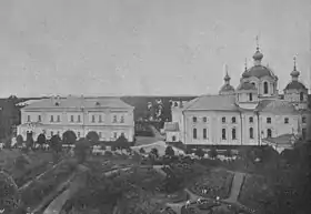 По периметру территория монастыря была обнесена глухой кирпичной оградой с четырьмя восьмигранными башнями по углам (1882—1884). Комплекс всех этих строений представлял собой яркий пример ансамбля периода господства эклетики[7][16][17].