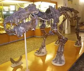 - Динотерии — вымерший род древних млекопитающих из семейства Deinotheriidae отряда хоботных. Динотерии обитали со среднего миоцена по ранний плейстоцен (20—2 млн лет назад). Были объектом охоты Homo habilis и ранних Homo erectus[16]