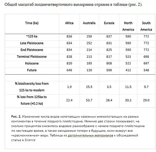 Всего за период 132 — 1 тыс. лет назад вымерли 177 известных науке видов наземных млекопитающих массой более 10 кг, в том числе 154 вида массой более 45 кг[9][22].