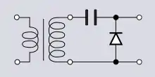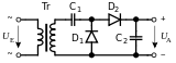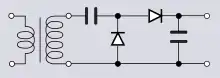 Предложен Виллардом в 1901 году[16]. Состоит из конденсатора, включенного последовательно с обмоткой, и диода, включенного параллельно нагрузке. Во время отрицательного полупериода ток течёт по цепи: «источник переменного тока — конденсатор — диод», конденсатор заряжается. Во время положительного полупериода заряженный конденсатор включается последовательно с обмоткой трансформатора, и напряжения на конденсаторе и обмотке суммируются.