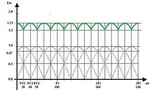 В этом выпрямителе есть большой период равный 360° и малый период, равный 60°. В большом периоде помещаются 6 малых периодов. Малый период в 60° состоит из двух зеркальносимметричных частей по 30°, поэтому для описания работы этой схемы достаточно разобрать её работу на одной части в 30° малого периода.