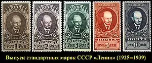 Стандартные марки СССР «Ленин» — высокономинальные стандартные марки от 1 до 10 рублей с портретом В. И. Ленина впервые были выпущены в июле 1925 — мае 1928 года. Они были выполнены металлографическим способом на обыкновенной бумаге с водяными знаками. Марки выпускались с зубцами трёх разных размеров и без зубцов (в 1926 году). Известны различные положения водяного знака (горизонтальное и вертикальное) и размеры рисунка по высоте (39×39,5 и 39,5×40 мм). В 1928—1929 годах марки номиналами в 3, 5 и 10 рублей были переизданы на бумаге с другим водяным знаком. Гравировал их А. Троицкий. С мая по ноябрь 1939 года эти же три марки были вновь переизданы, но на рыхлой и гладкой бумаге без водяного знака. Известны по два размера рисунка по высоте каждой марки: на рыхлой бумаге — 39×39,5 мм и на гладкой бумаге — 39,5×40 мм[1][2][3][4][5][6].