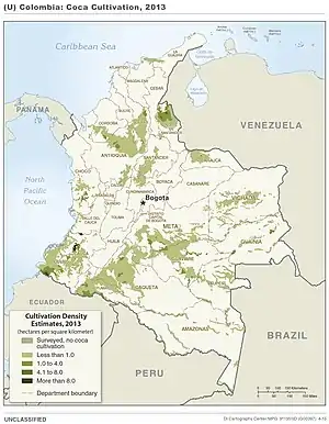 Выращивание коки в Колумбии осуществляется в широких масштабах. По данным на 2006 год, производством коки было занято примерно 67 000 домашних хозяйств, главным образом в департаментах Путумайо, Какета, Мета, Гуавьяре, Нариньо, Антьокия и Вичада[1].