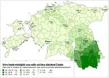 Процент носителей выруского языка в эстонских муниципалитетах и их численность в наиболее крупных населённых пунктах, по данным ежегодной переписи в 2011 году