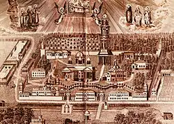 - четырёхъярусная «падающая»[5] колокольня высотой 75 м[1], смотровая площадка — 60 м[5] (1800—1830[1]),