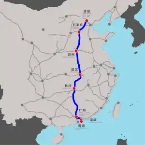 Эта трасса длиной около 2230 км рассчитана на движение со скоростью 350 км/ч (с 2011 года понижено до 300 км/ч). Железная дорога строилась участками, которые поочерёдно вводились в эксплуатацию. Начало строительства первого этапа — 23 июня 2005 года. Первый этап (Ухань — Гуанчжоу) был пущен в 2009 году, в конце 2011 года дорога была продлена далее до города Шэньчжэнь, в конце 2012 года пущены северные участки от Пекина до Уханя и открылось сквозное движение поездов от Пекина до Шэньчжэня[3], а в конце 2015 года пущен небольшой участок до границы с Гонконгом.