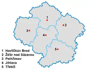 Край Высочина состоит из 5 районов, которые в свою очередь делятся на 15 муниципалитетов с расширенной полномочиями и 26 муниципалитетов[6].