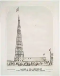 К главному зданию выставки — New York Crystal Palace — примыкала обсерватория Латтинга, деревянная башня высотой 96 метров. На тот момент это была самая высокая постройка Нью-Йорка — выше шпиля Троицкой церкви (88 метров).