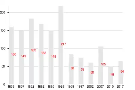 | 1838 | 1862 | 1885 | 1928 | 1958 | 1997 | 2007[22] |
