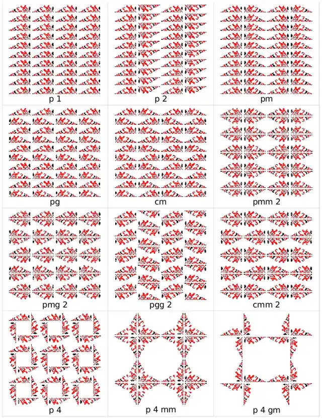Хотя различают 17 групп симметрии решетчатых орнаментов, определено, что при вышивке крестом используют только 12 групп[1].