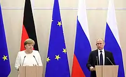 В тот же день на совместной пресс-конференции с канцлером ФРГ Ангелой Меркель в Сочи Путин отметил, что затронул в беседе тему «беспрецедентного» задержания Вышинского, тогда как она отметила, что обсудит с президентом Украины Петром Порошенко данный случай, также, «как я говорила о российских журналистах, которых здесь арестовывают, и они не могут заниматься своей работой»[149][150][151][152][153]. Позже в МИД ФРГ выразили озабоченность в связи с ситуацией с Вышинским[154][155], отказавшись сообщить подробности конфиденциального разговора Меркель и Порошенко[156][157], в котором были затронуты итоги переговоров в Сочи[158][159], но отметив важность вопроса свободы СМИ[160][161].