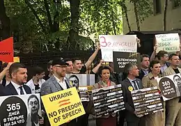 18 мая под дождём у посольства Украины в Москве прошёл согласованный с мэрией митинг в поддержку Вышинского с участием Симоньян и Киселёва, российских журналистов, членов Общественной палаты, ЛДПР, «Единой России» и Общероссийского народного фронта, в том числе депутата Госдумы Петра Толстого и гендиректора «News Media» Арама Габрелянова, в общей сложности порядка 200 человек[142][143][144][145][146][147]. В то же время в «РИА Новости» организовали информационную кампанию, обратившись с просьбой прокомментировать ситуацию с Вышинским в несколько десятков иностранных СМИ, в частности Великобритании, Франции, Германии, США, но практически не получили ответов[148].