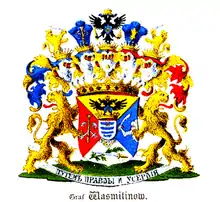 Щит покрыт Графскою короною, на поверхности которой пять шлемов, увенчанные средний Графскою, а прочие дворянскими коронами; из них на средней находится орёл, в гербе означенный, на крайних двух по одному льву с поднятым мечом, а на последних, имеющих страусовые перья, с правой стороны крестообразно положены два якоря со скипетром, а с левой лилия, означенные в гербе. Намёт на щите золотой, подложенный голубым и красным. Щит держать два льва. Под щитом девиз: «Путём ПРАВДЫ И УСЕРДИЯ».