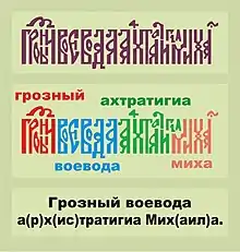 Вязь — тип древнего декоративного кириллического письма, в котором буквы сближаются или соединяются одна с другой и связываются в непрерывный орнамент. Известен с XIII века в южнославянских памятниках, с конца XIV – начала XV века. – в восточнославянских и валашских регионах, получила значительное развитие в Русском царстве в XVI веке, в царствование Ивана IV Грозного. В Средние века, а также во времена существования Киевской Руси и Галицко-Волынского княжества, она не использовалась.