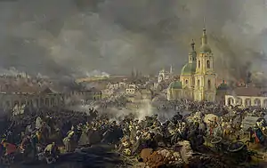 В Отечественную войну 1812 года в августе у города проходили бои во время отступления русской армии. Вязьма была сдана без боя и подожжена жителями.[8][9] Около Вязьмы русские войска 22 октября (3 ноября) 1812 года нанесли поражение отступавшей наполеоновской армии. В честь этого события в городе сооружены два памятника. Особо отличился пехотный Перновский полк, первым ворвавшийся в город[10].