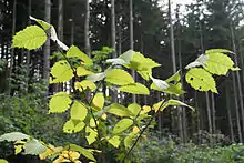 Почки яйцевидные или притуплённые. Листья продолговато-яйцевидные, длиной 5—10 (до 15) см, остроконечные, у основания неравнобокие, по краю двоякозубчатые, сверху голые или шершавые, снизу почти голые или опушённые, на черешках длиной 5—8 мм.