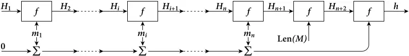 Каждый блок сообщения, начиная с первого, подаётся на шаговую функцию для вычисления промежуточного значения хеш-функции: