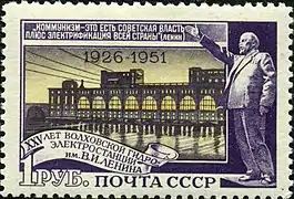 Почтовая марка СССР, 1951 год: «Коммунизм — это есть советская власть плюс электрификация всей страны» (В. И. Ленин). — «XXV лет Волховской гидроэлектростанции им. В. И. Ленина (1926–1951)». (ЦФА [АО «Марка»] № 1666)