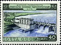 Почтовая марка СССР, 1954 год: «Широко развернуть строительство колхозных гидроэлектростанций!»